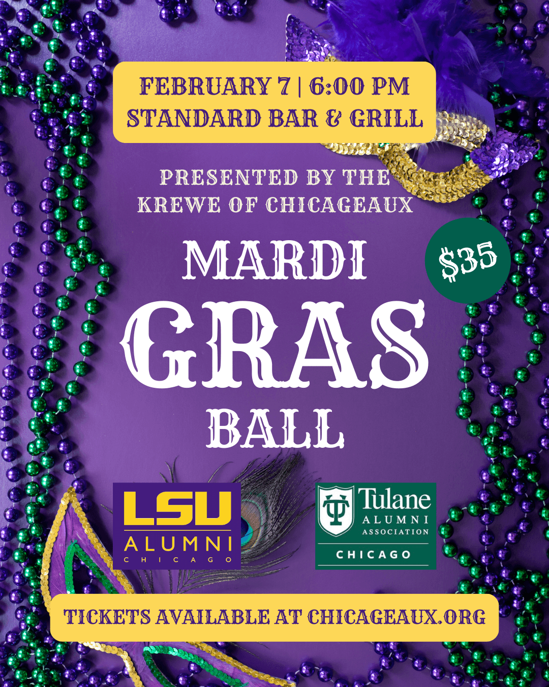 Celebrate Mardi Gras in your home away from home with the Krewe of Chicageaux. The LSU and Tulane Alumni Clubs of Chicago are thrilled to host our third annual celebration at the Standard Bar and Grill.